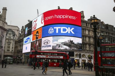 In 2005, TDK renovated the previous fluorescent tube neon sign into a more environmentally friendly and energy-efficient LED neon sign, which finally enabled the presentation of animated advertisement spots. After 25 years of advertising at Piccadilly Circus TDK has decided to discontinue its promotion. The decision is based on the company's shift towards Business to Business (B to B) operation, centered on the promotion of electronic components for applications in the ICT, consumer, automotive and industrial electronics world. This business is based on magnetic materials such as ferrite, a material that TDK has developed since its founding.