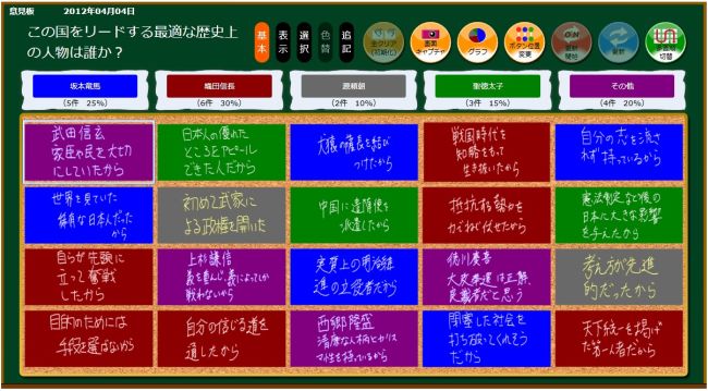 「マーナビケーション」は、FNETSが「協働学習」用に現場の教師とともに開発したデジタル教材です。各生徒がタブレットに手書き入力した回答内容を教師が即時に電子黒板に表示する「意見板」機能があります。大分豊府中学校は、これを活用することにより、生徒一人ひとりが自分の考えをしっかり持ちながら、他者の多様な考えを受け入れ、問題解決に取り組むための思考力・判断力・表現力の向上や学ぶ意欲の高揚につながる双方向型の授業をめざします。さらに、「理解度チェック小テスト」機能を用いて、教師が小テストの正答率を即時に確認し、生徒の理解状況を把握しながら理解度を深める授業の実践に向けた研究に取り組む予定です。