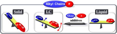 To assess the effects of attached alkyl chains, the NIMS team collated research that studied the properties of pi-conjugated molecules modified with specific alkyl chains. Some studies demonstrated that different types of alkyl chains, solvent polarity, temperature and chain-substrate interactions led to the assembly of pi-conjugated molecules into various two- and three-dimensional structures. Other studies showed that alkyl chains with certain structures allowed the formation of "thermotropic" liquid crystalline materials - which have properties between those of hard solids and soft liquids - as well as the formation of materials that were "isotropic" liquids at room temperature and from which photoconducting liquid crystals or gels could be formed. The authors describe this strategy as "alkyl-pi engineering" in their review article.