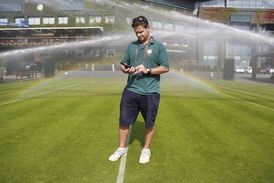 Grant Cantinが灌漑システムのコントローラを押すと、数秒のうちに、スプリンクラーのノズルが表れ、ウィンブルドンの全41コートのうちの1つに散水されます。晴れた日のロンドンの空と散布された水は、手入れが行き届いた緑の芝生の上に虹を出現させます。