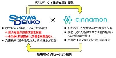 昭和電工株式会社(社長:森川 宏平 以下、昭和電工)と株式会社シナモン(代表取締役:平野 未来 以下、シナモン)は、AIを活用した技術文書活用システムを共同で開発することを決定しました。本開発は、国立研究開発法人 新エネルギー・産業技術総合開発機構(NEDO)の「AIシステム共同開発支援事業*」の助成事業として採択されています。