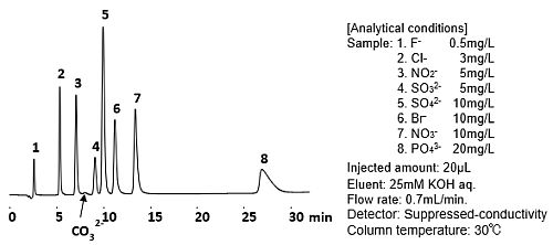 Analysis with the 'IC SI-36 4D' column - Analysis of 7 standard anions, sulfite and carbonate with the 'IC SI-36 4D' column showed high resolution. - Hydroxide eluents have lower background electrical conductivity than carbonate eluents. The combination of new column with hydroxide eluents can perform supersensitive analysis. - A combination new column with hydroxide eluents does not require different eluents (gradient system), but can perform separation with a single eluent (isocratic system) within 30 minutes.