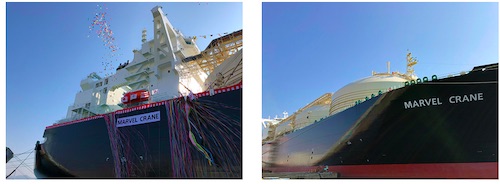 Mitsubishi Shipbuilding received the order for the new vessel through MI LNG Company, Limited, a joint venture for the design and sale of LNG carriers established by MHI and Imabari Shipbuilding Co., Ltd. Construction was managed by Mitsubishi Heavy Industries Marine Structure Co., Ltd., an MHI Group company based in Nagasaki. Launching took place on August 3, 2018. Mitsui & Co., Ltd. named its LNG carriers for the Cameron LNG Project "MARVEL" and "CRANE," after the migratory bird.