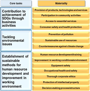 In 2015, SDK specified its 14 material issues, and has been conducting business and CSR activities always conscious of these issues since then. Recognizing the revision of CSR policy as a good opportunity, we categorized those 14 material issues under three "core tasks," namely, "Contribution to achievement of SDGs through business activities," "Tackling environmental issues," and "Establishment of sustainable methods for human resource development and improvement in working environment." Hereafter, we will set key performance indicators (KPIs) to evaluate our progress in solution of these material issues. At the same time, we will make our Group employees and outside stakeholders universally understand the three core tasks and our basic action plan corresponding to them.