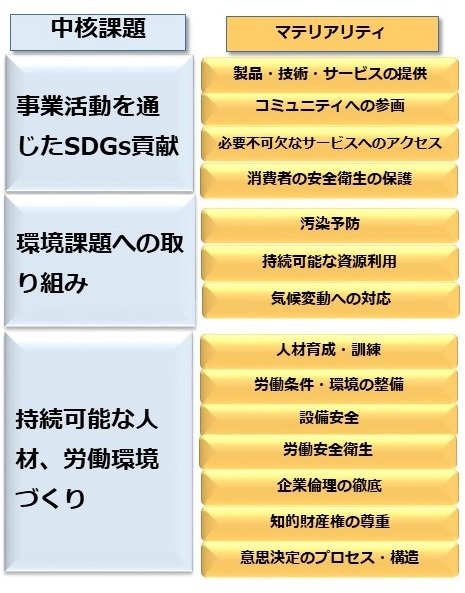 当社は2015年に14のマテリアリティ(重要性)を特定し、事業活動やCSR活動に取り組んでまいりました。CSR方針の改定に併せ、マテリアリティの重点をより明確にするため、「事業活動を通じたSDGs貢献」、「環境課題への取り組み」、「持続可能な人材、労働環境づくり」の3つの中核課題に集約しました。今後は、マテリアリティに中期的なKPIを定めて進捗を管理していくと同時に、中核課題をその方針とともに明確に示し、グループ内外の周知・浸透を図ります。