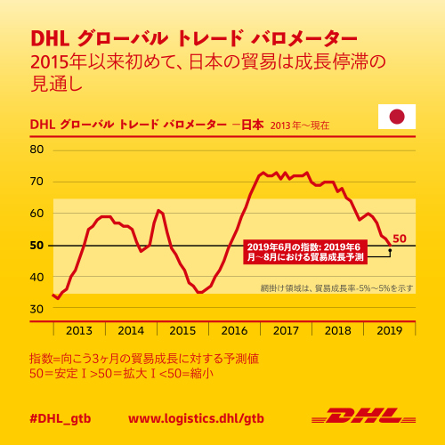 DHLグローバル・トレード・バロメーター(「GTB」または「本バロメーター」)の報告書では、日本の貿易は翌四半期に2015年以来初めて停滞する見通しです。このDHLグローバル・トレード・バロメーター(人工知能、ビッグデータを駆使することにより算定される国際貿易成長に対する早期指標)では、2019年6月から8月にかけて、日本の貿易成長率の低下傾向が加速し、総合指数は7ポイント下げ50ポイントを記録する見通しを示しています。[1]