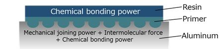SDK has enabled such direct joining/bonding based on its expertise in aluminum alloys and polymer chemistry gained over many years. Specifically, SDK has developed an innovative joining/bonding technology based on special surface treatment and primer treatment for aluminum alloys, realizing chemical bonding power[1] in addition to the anchor effect. Our experiments show that the new technology can be used under ordinary polycarbonate molding conditions, providing sufficient bond strength of more than 25MPa (mega pascal)[2]. There is no need for special conditions or equipment in securing sufficient bond strength.