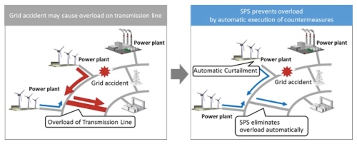 The SPS is a next-generation grid automatics system preventing the overloading of transmission lines. The system plans optimal countermeasure actions for specific accidents on the power network based on the real-time network status. If an accident actually occurs, the SPS carries out controls automatically (primarily for the automatic control of wind generation) in order to prevent overloads in the power grid.