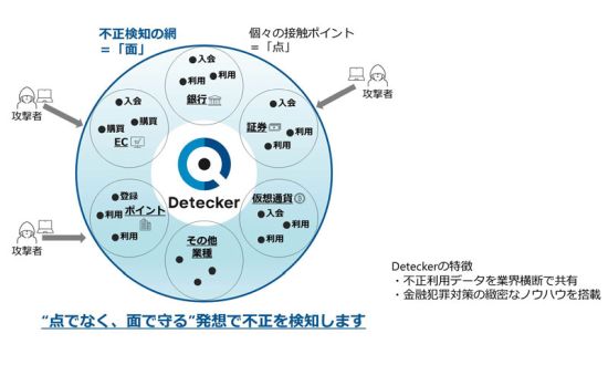 「Detecker」は、セブン銀行が培ってきた金融犯罪対策の緻密なノウハウを不正検知モデルとして搭載しており、企業のオンラインサービスに攻撃者がアクセスする際の一連の挙動から、通常の利用者とは異なる不自然な動きを AI を用いて検知することが可能です。また不正を検知した際、攻撃情報をプラットフォーム上で蓄積・共有することで、同一の攻撃者から全てのプラットフォーム利用企業を守る"面"での防御を可能とします。業界を横断して活動する攻撃者に対し、"点でなく、面で守る"ことで不正利用の未然防止につながります。