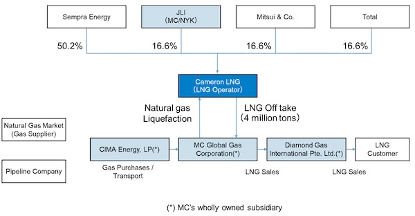 JLI owns a 16.6% interest in the project, which is run by Cameron LNG, LLC (CLNG). MC is both engaged in the project's management through JLI and owns the rights to approximately four million tons of its production, the equivalent output of one liquefaction train. MC also sources natural gas as a feed gas for the project via CIMA Energy, LP, its wholly-owned, gas marketing company based in the US. Liquefaction of the feed gas is contracted to CLNG through a tolling agreement. The LNG that MC owns the rights to is sold in Japan and around the world, primarily through long-term contracts with Diamond Gas International Pte. Ltd., MC's wholly-owned LNG sales company based in Singapore.