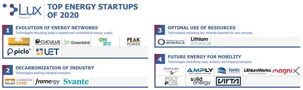 今回、注目すべき石油・ガス・エネルギー分野のスタートアップとして発表された企業は、ラックスリサーチより最も評価の高い評価である『ストロング・ポジティブ(Strong Positive)』および『ポジティブ(Positive)』評価を受けた20社です。これら企業はラックスリサーチがエネルギー分野において注目する下記4つのテーマにて分類されています。