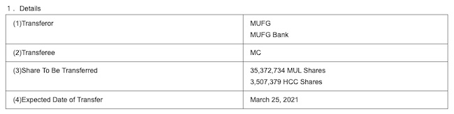 Mitsubishi Corporation (MC) is pleased to announce its signing today of a share-transfer agreement with Mitsubishi UFJ Financial Group, Inc. (MUFJ) and MUFG Bank, Ltd. (MUFG Bank). Under the terms of the agreement, MUFG and MUFG Bank will transfer to MC some of their shares in both Mitsubishi UFJ Lease & Finance Company Limited (MUL) and Hitachi Capital Corporation (HCC). See details below.