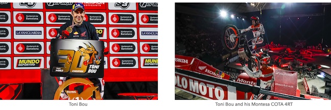 Repsol Honda Team rider Toni Bou has won his 15th consecutive FIM(1) X-Trial World Championship at the final round in Barcelona on November 21. With his 15 consecutive victories in the FIM Trial World Championship, Toni Bou has won an unprecedented 30 consecutive world championship titles.