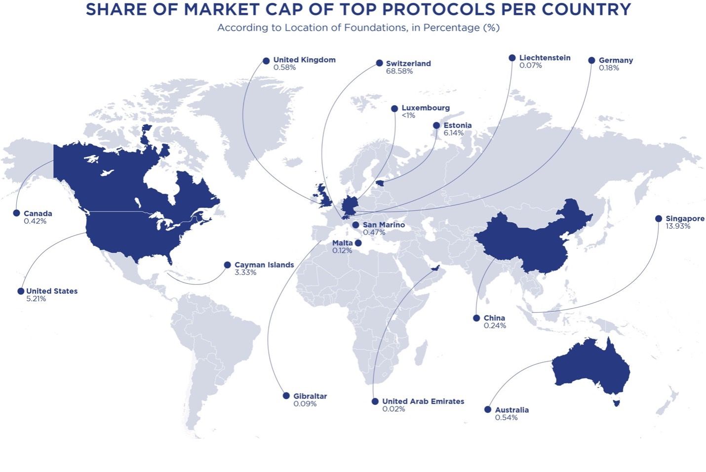 The Global Protocol Report introduces a comprehensive framework for assessing the maturity of DLT protocols, facilitating informed decision-making with concise protocol fact sheets. The report also reveals Switzerland’s dominance with 68.58% of the share of market cap of top protocols per country, followed by Singapore at 13.93%. The Global Protocol Report boasts some illustrious partners such as Coindesk Indices, Dialectic, DFINITY, Hedera, and Sui.