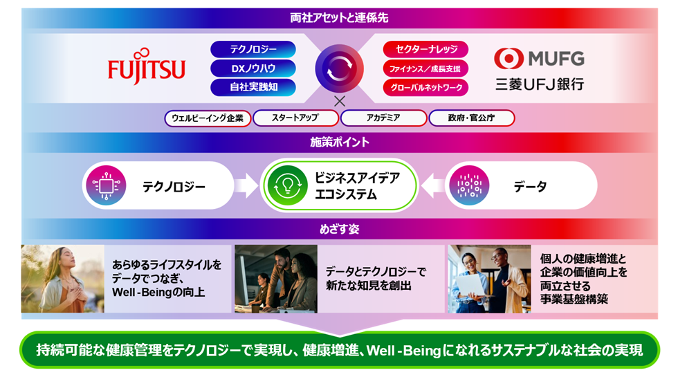 三菱UFJ銀行は、本協業を通じて、少子高齢化社会や産業育成、イノベーション支援に関する課題の解決をめざします。富士通は、本協業で得た知見やネットワークを活用し、様々なウェルビーイング関連企業がデータ連携でき、生活データや個人の食事や運動などのライフログデータをもとに、生活者一人ひとりにパーソナライズドされたサービスを提供するプラットフォームの確立をめざします。