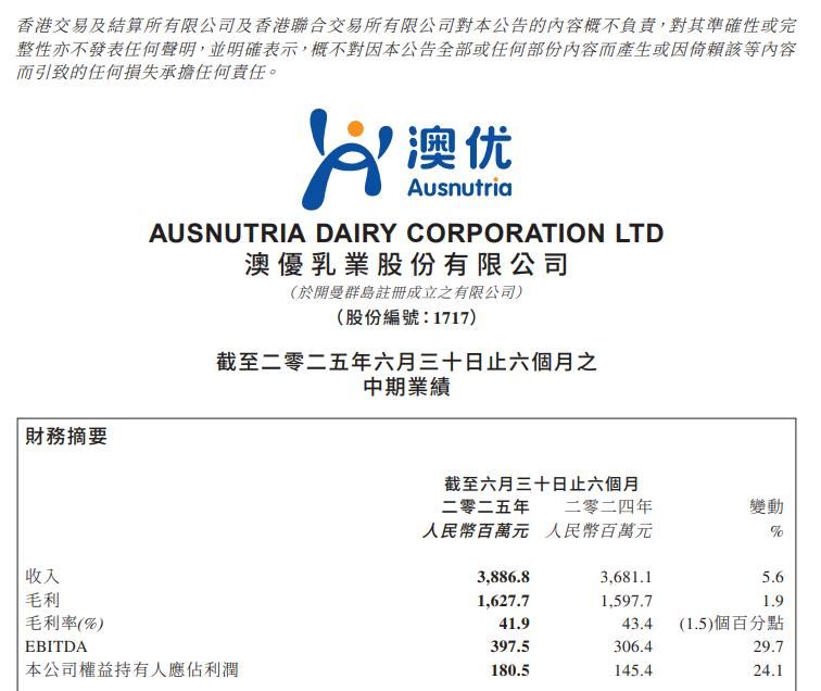HONG KONG, Aug 28, 2025 - (ACN Newswire) - On August 27, Ausnutria Dairy Corporation Ltd (Stock Code: 1717.HK, hereinafter referred to as “Ausnutria” or “the Company”) released its 2025 interim results announcement. According to the announcement, from January to June 2025, Ausnutria achieved operating revenue of approximately RMB 3.887 billion, representing a year-on-year increase of 5.6%; EBITDA (Earnings Before Interest, Taxes, Depreciation and Amortization) reached approximately RMB 398 million, a year-on-year increase of 29.7%; profit attributable to equity holders of the parent company amounted to approximately RMB 181 million, a year-on-year increase of 24.1%, demonstrating sustained resilient growth in both revenue and profit.