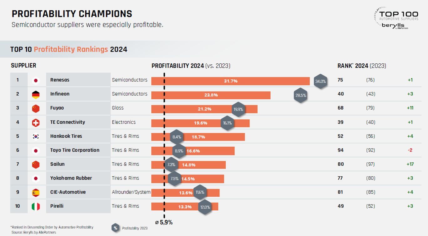 市場環境は非常に厳しかったにもかかわらず、トップ100企業の対売上高利益率は前年比並みの5.8%(2023年は5.9%)を維持しました。これは、サプライヤー企業が実施した様々なコスト削減策やリストラ策が功を奏したとみています。